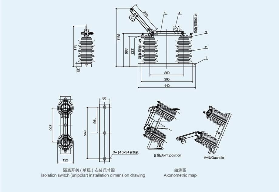 本產品為單斷口垂直打開式結構,單極隔離開關支柱絕緣子安裝在各自底架上,主要由底座、支柱絕緣子、主導電回路部分、自鎖裝置等組成。采用閘刀式結構分合閘達到切斷和閉合線路。每相閘刀由兩片導電刀片組成,刀片兩側外裝有壓縮彈簧,調節(jié)彈簧的高度可以得到開關閘刀所需要的接觸壓力。開關分合閘時用絕緣鉤棒操作機構部分,閘刀有自鎖裝置。